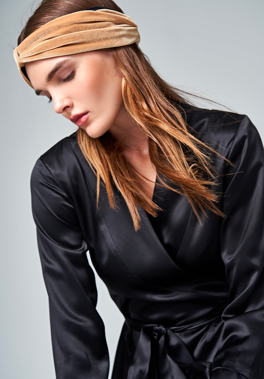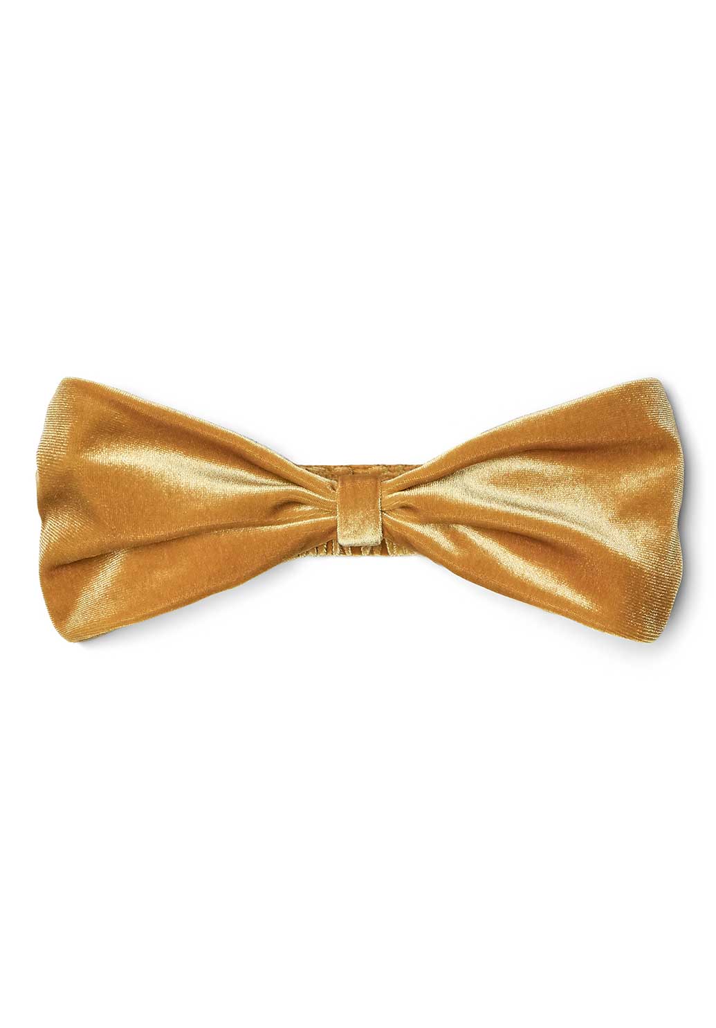 Accessorize Charlene Tang pieces with this gold stretch velvet bow headband. Lined with soft Tencel jersey for comfortable wear.