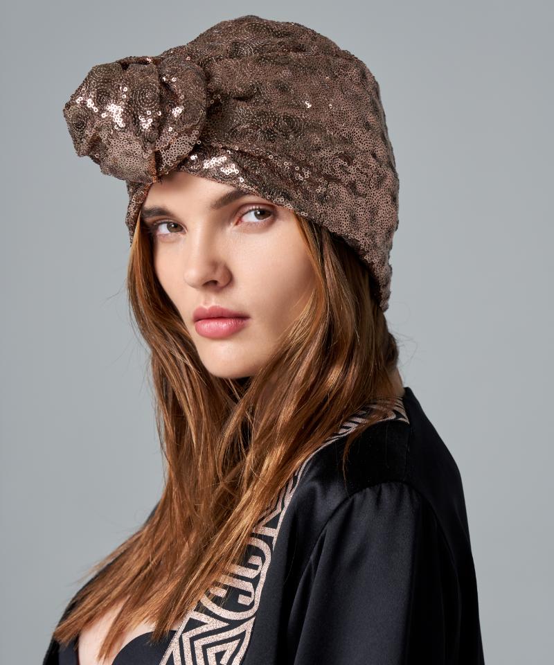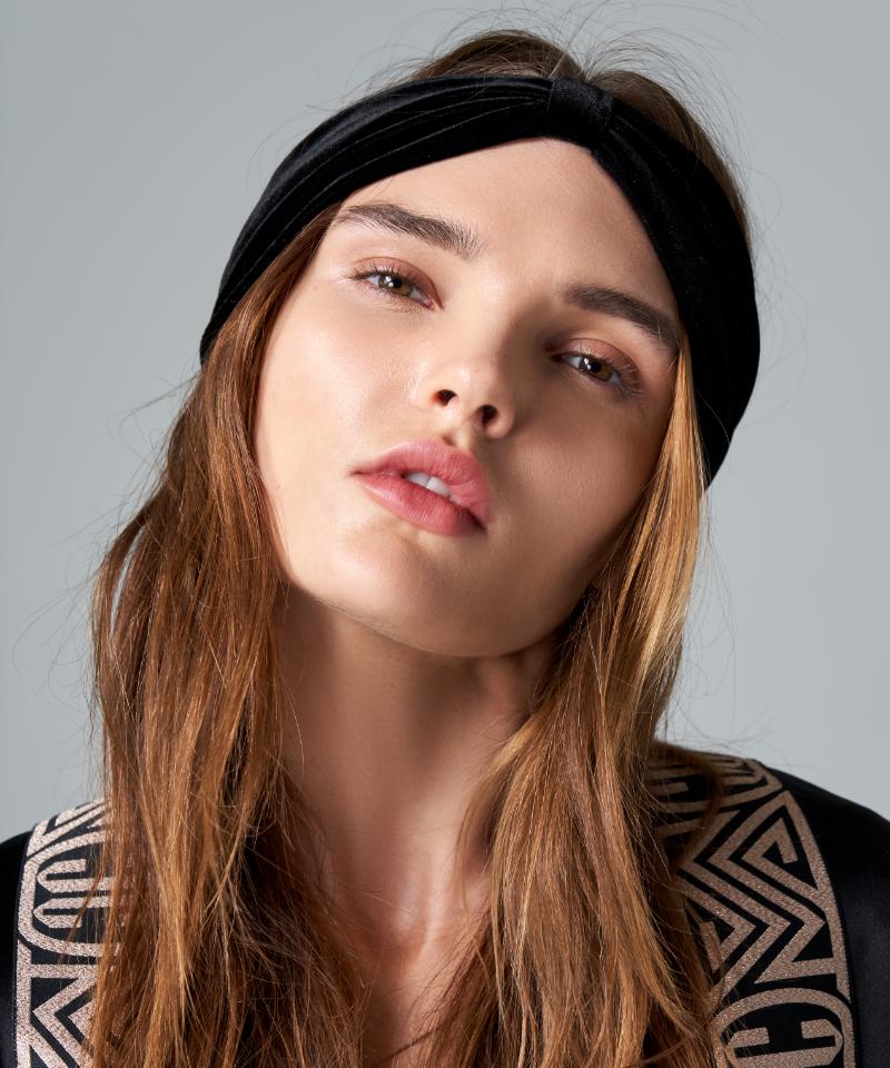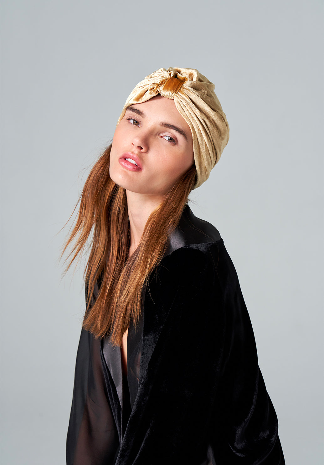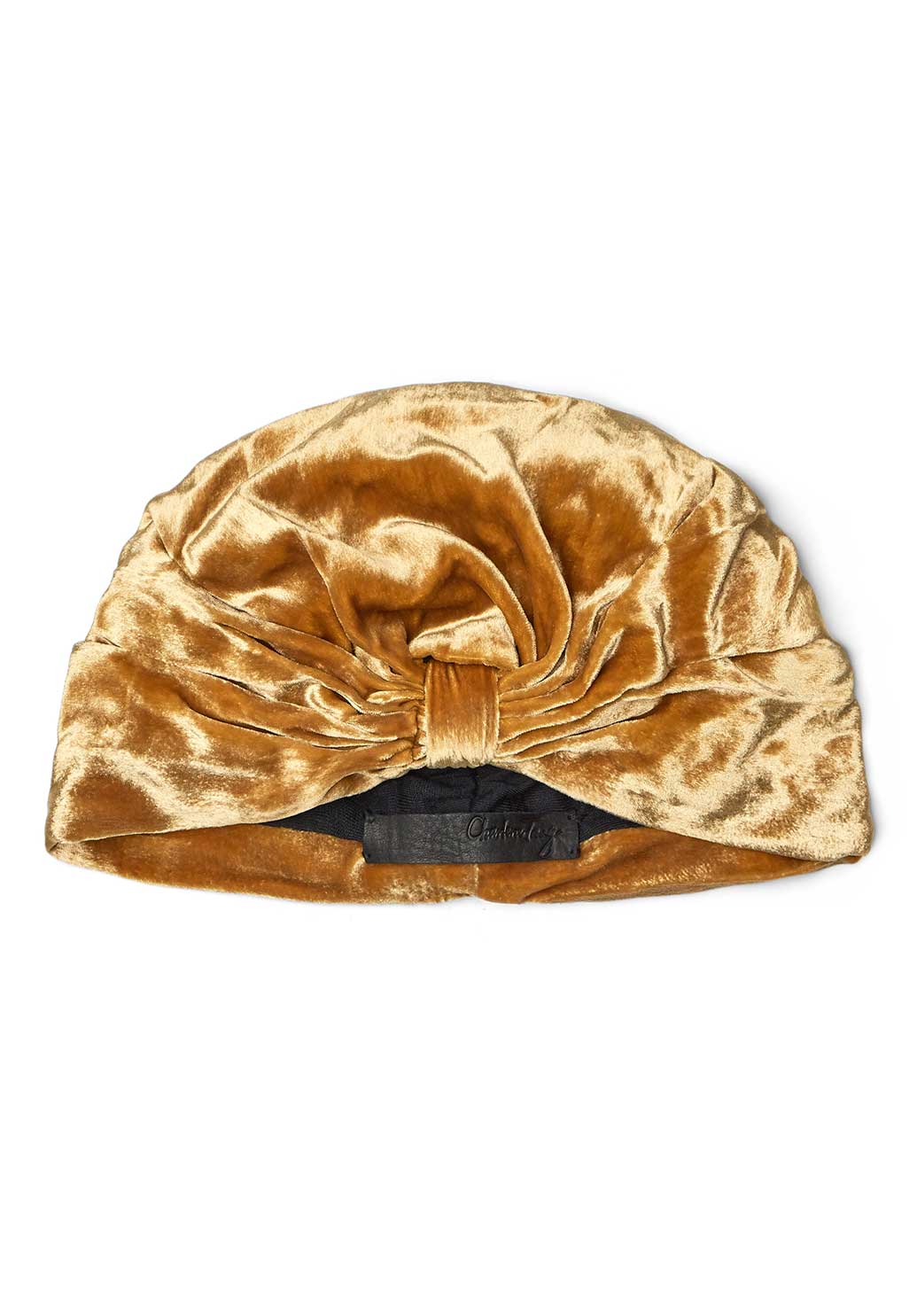 Accessorize Charlene Tang pieces with this gold silk velvet turban. Lined with soft Tencel jersey for comfortable wear.