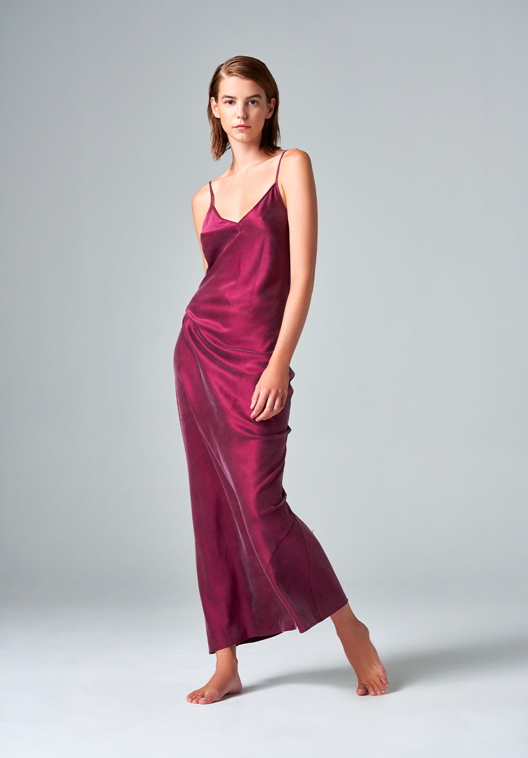 Bias cut silk maxi dress featuring asymmetrical draped pleat at side waist. Featuring sand washed silk for a casual look.