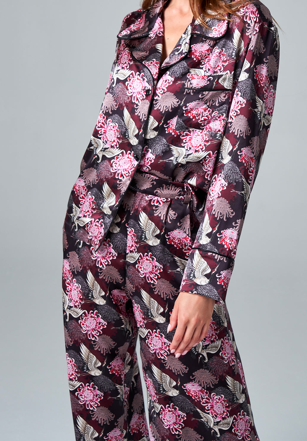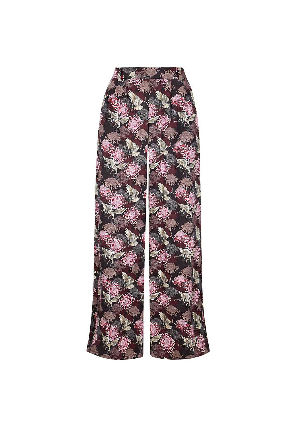Palazzo pants featuring Chrysants flower printed silk in burgundy colorway. Showcases a front waist pleat detail. Pairs well with Charlene Tang Burgundy Chrysants Flower Pajama Top.