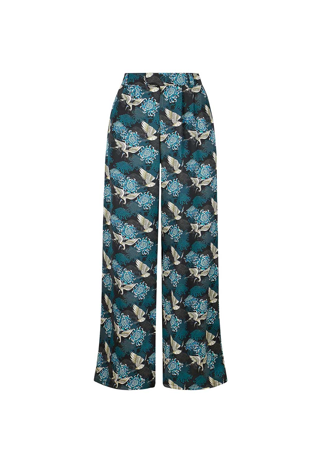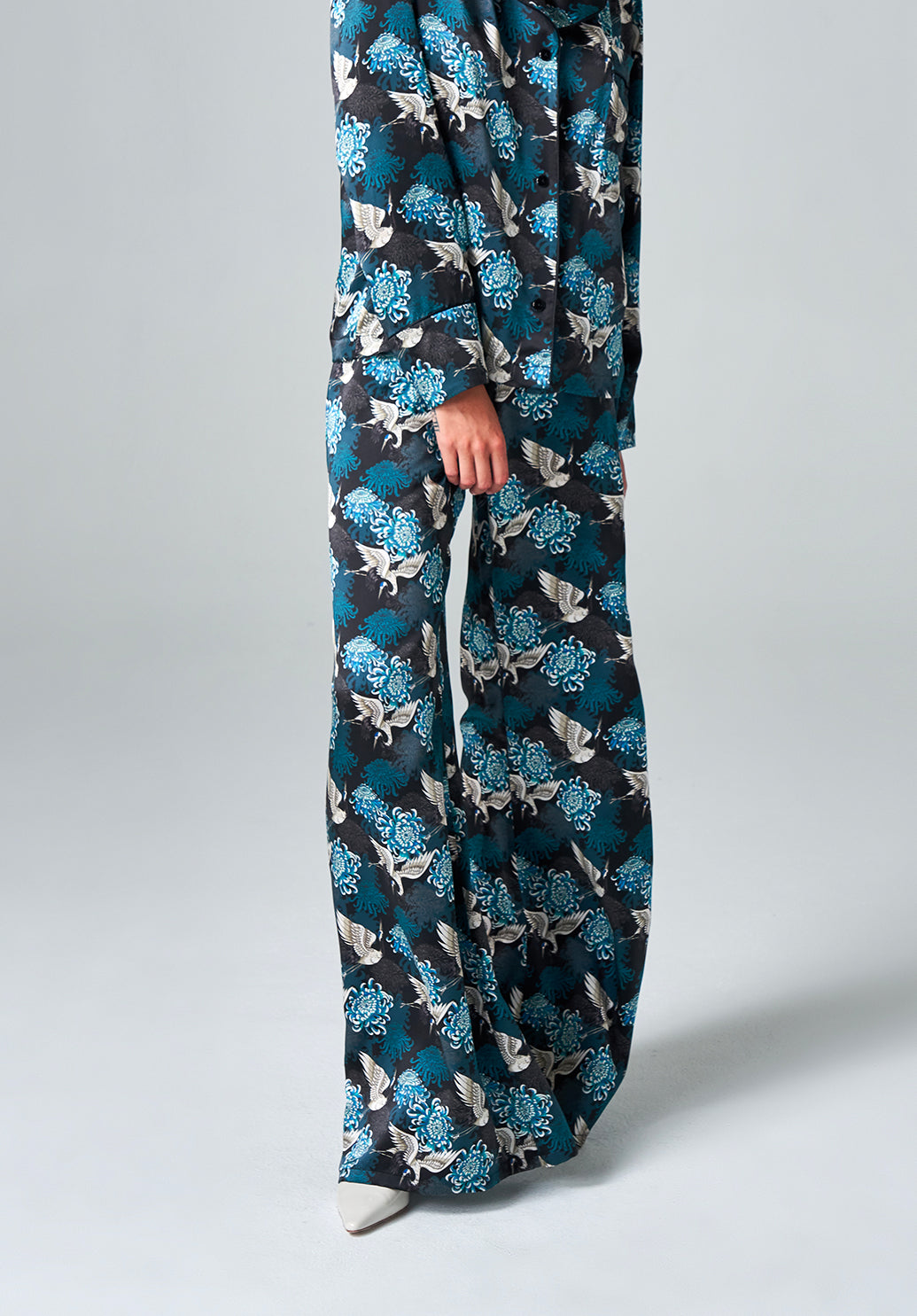 Palazzo pants featuring Chrysants flower printed silk in teal colorway. Showcases a front waist pleat detail. Pairs well with Charlene Tang Teal Chrysants Flower Pajama Top.