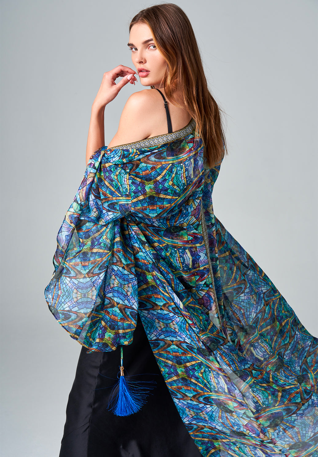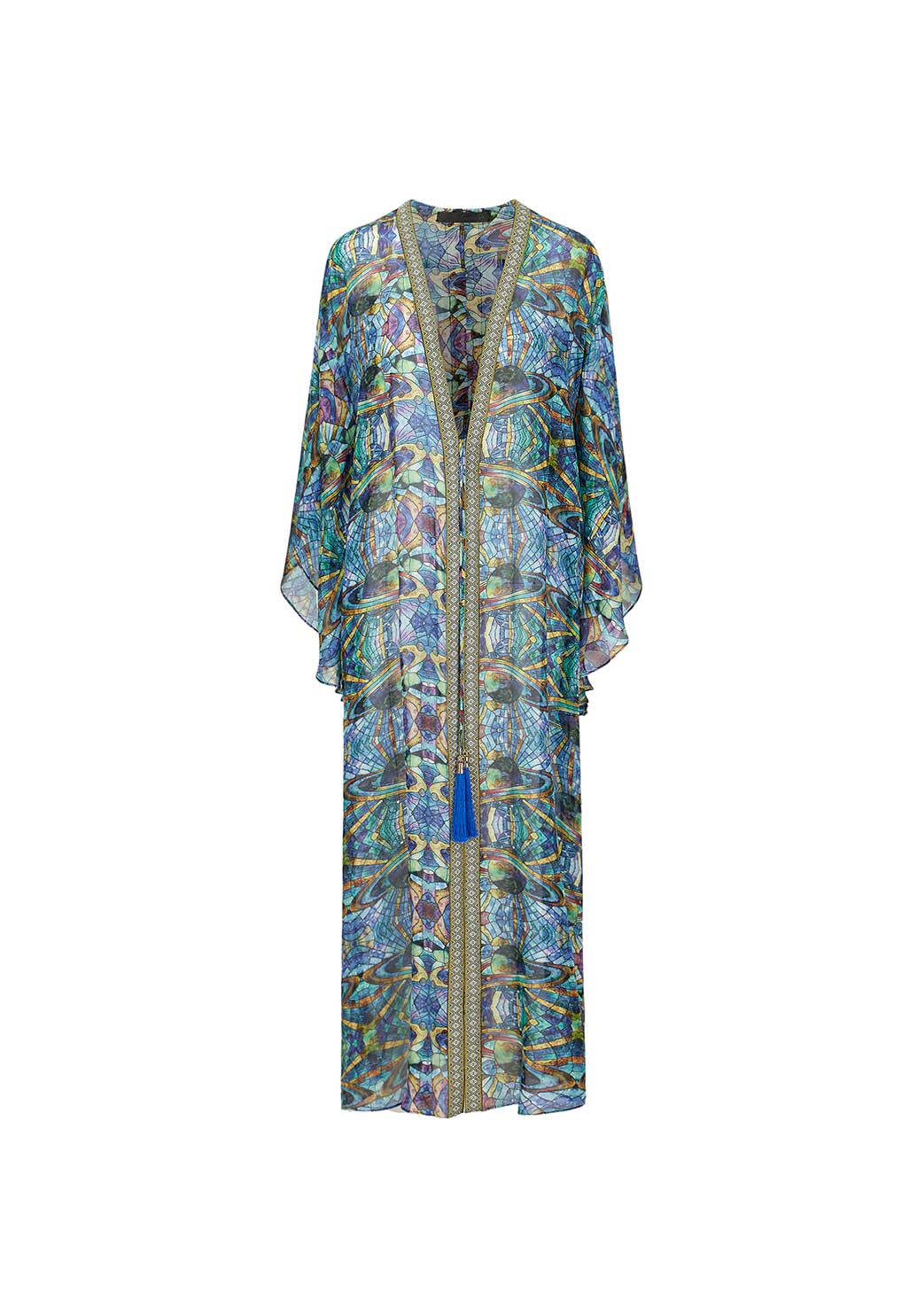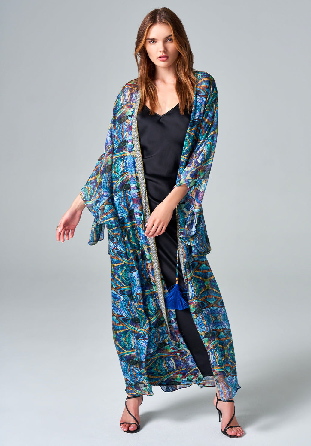 Floor length Kimono inspired by Istanbul stained glass. Showcases a Saturn planet stained glass printed on silk chiffon in blue colorway. Open front features a Charlene Tang monogram jacquard trim with custom embellished tassel self -ties. This one-of-a-kind art will channel your inner goddess.