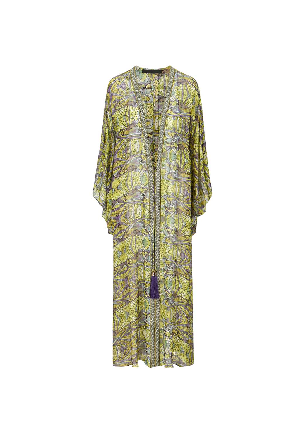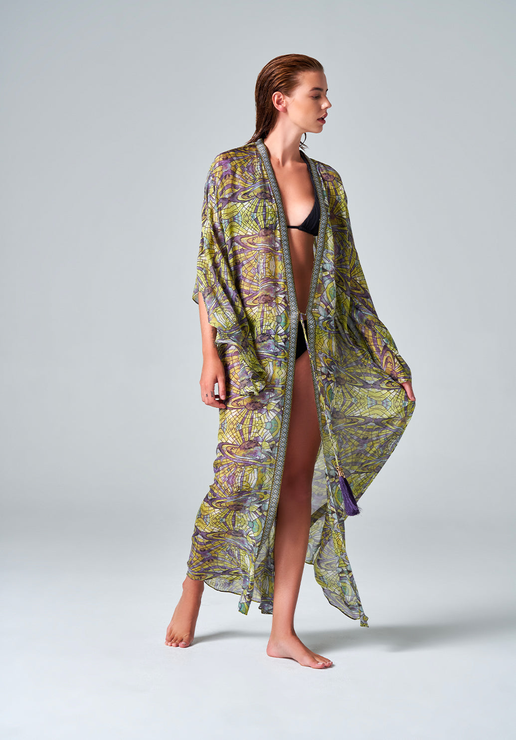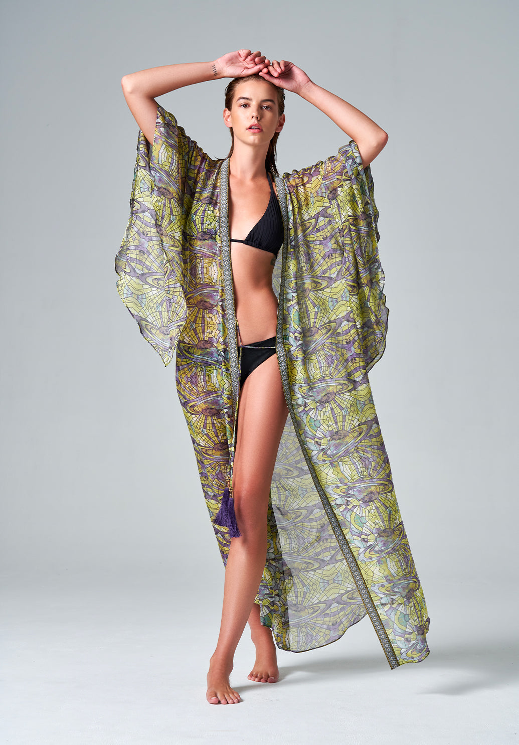 Floor length Kimono inspired by Istanbul stained glass. Showcases a Saturn planet stained glass printed on silk chiffon in yellow colorway. Open front features a Charlene Tang monogram jacquard trim with custom embellished tassel self -ties. This one-of-a-kind art will channel your inner goddess.